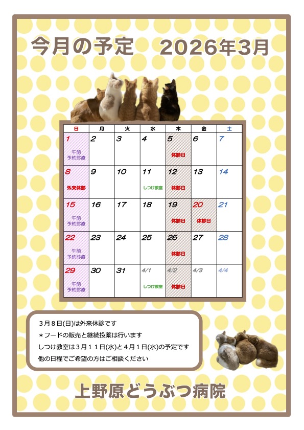 | 3月8日(日)午前中は外来休診です。 フードの販売と継続投薬は行います。 >>今月のカレンダー しつけ教室は3月11日(水)と4月1日(水)の予定です。 当院のしつけ教室はプライベートレッスンのため予約が必要です。お仕事などの都合などで予定の合わない方はご相談ください。 |