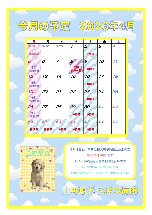 | 4月8日(水)午前中は外来休診です。 フードの販売と継続投薬は行います。 >>今月のカレンダー しつけ教室は4月15日(水)の予定です。 当院のしつけ教室はプライベートレッスンのため予約が必要です。お仕事などの都合などで予定の合わない方はご相談ください。 |